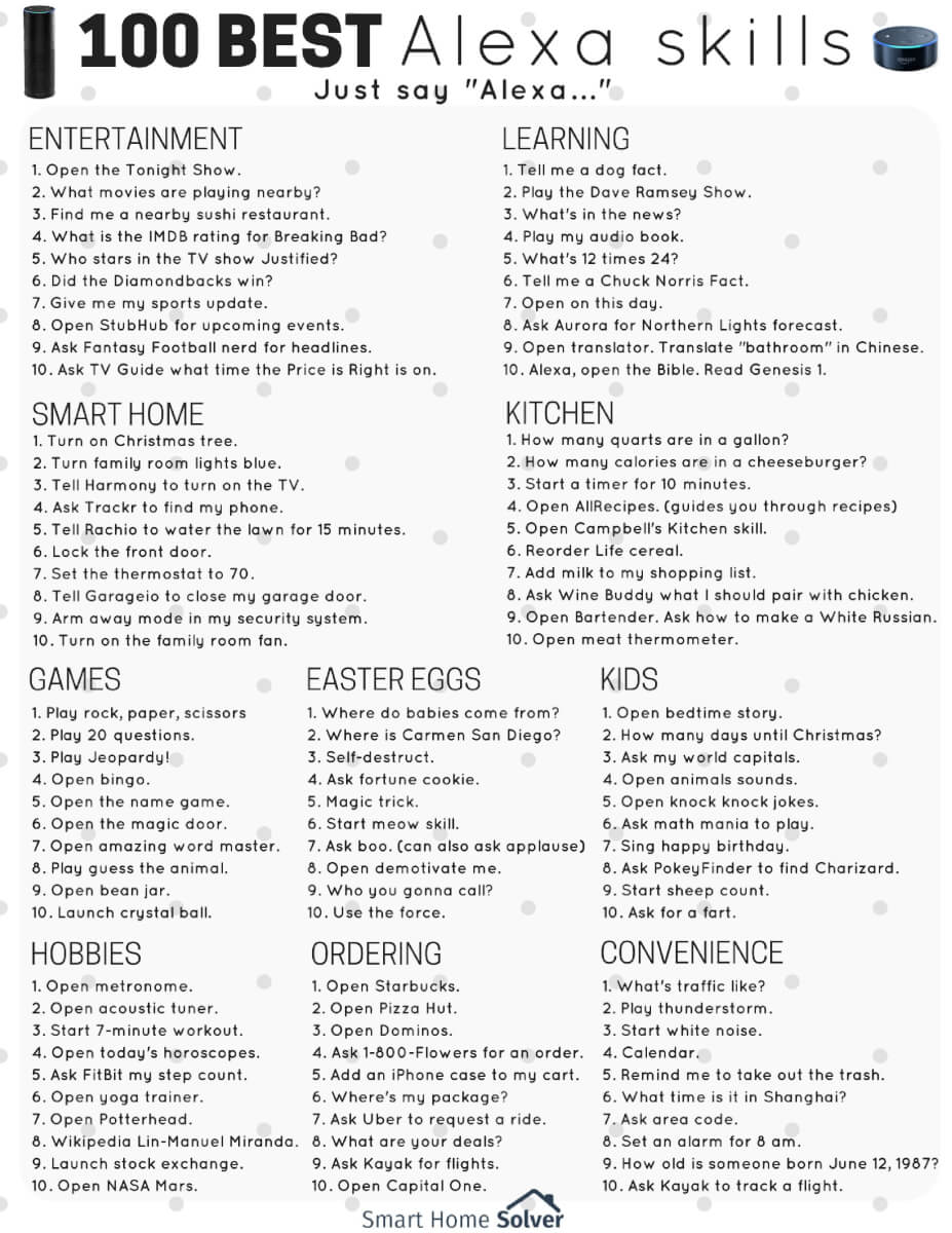 Our suggestion? Print out some of the best Alexa commands and keep the list handy next to your Alexa device. You can reference it when you forget the exact phrasing of a certain command, or if you are just wanting to try some new skills. The Smart Home Solver team put together an infographic that is sized as a printable. It has 100 little-known Alexa skills that is a helpful reference for Alexa fans.