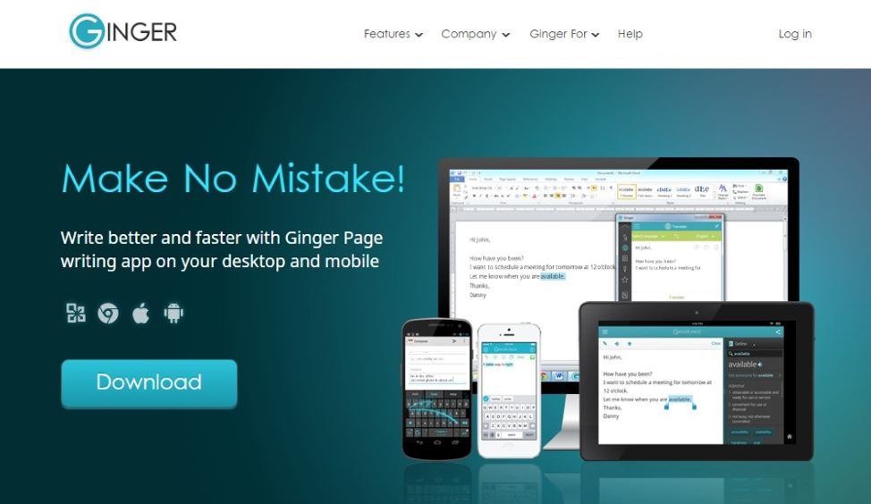 Ginger can be installed on PC, tablets & mobiles allowing you to access it wherever you are. It can seamlessly integrate with most popular word processors such as MS Word, Google Sheets and Open Office, and even your web browser so you can work faster and be efficient.