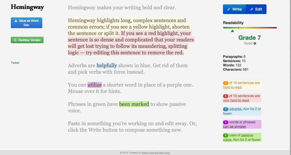 Named after the great American novelist, this tool allows you to write great articles by parsing them and providing style suggestions that you can use to improve your content. For example, if a sentence is highlighted in yellow it means that your statement is complex & lengthy, and that you might want to shorten or split. If it’s highlighted in red, it means that your sentence is so dense that the reader is sure to lose track of the logic.
