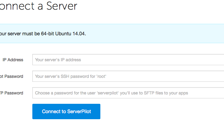 Here’s where you enter the IP address of your DigitalOcean droplet, the root password emailed to you by DigitalOcean, and a password (of your choosing) for the SSH/SFTP user serverpilot. Then, click Connect to ServerPilot.