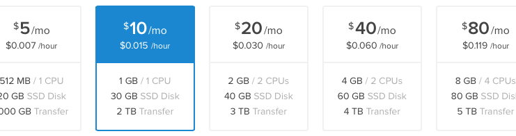 Once you have entered a name for your droplet, you need to select the size of the droplet, which basically means you need to pick a server that can handle your website/app. One thing to note, the amazing thing about DigitalOcean’s droplet’s is that you can easily and quickly upgrade them anytime, pretty much on the fly. So don’t worry if you find yourself outgrowing the current droplet size you selected.