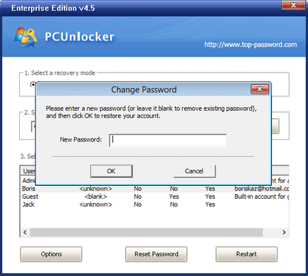 And now for the magic. Once you have successfully booted to the PCUnlocker disk (which may take a minute or two), you will see a screen with some options.