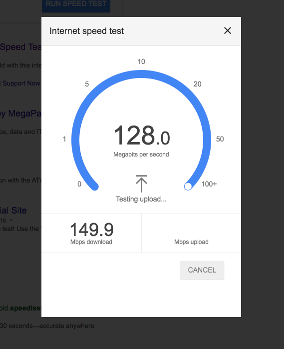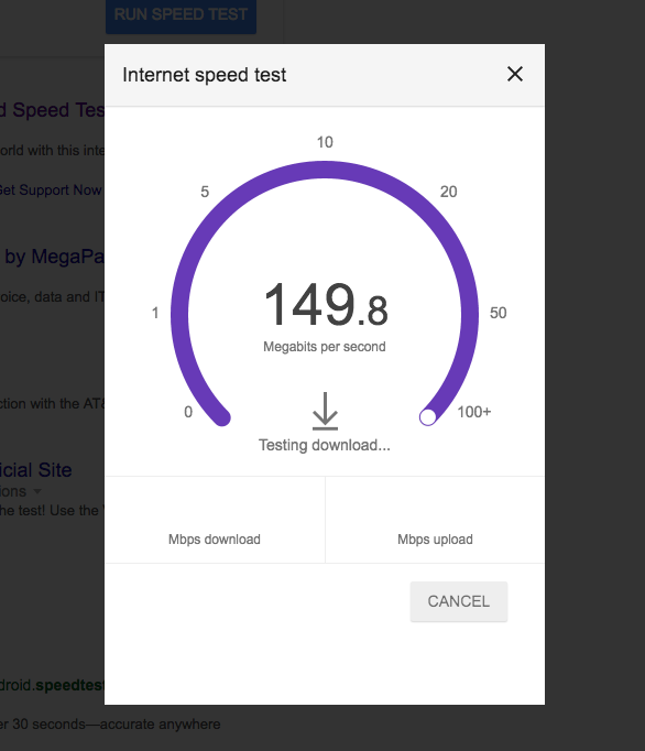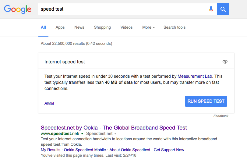 Yep, Google. Right within your search results, you never even have to leave the google.com domain. It’s pretty nifty. I stumbled across the feature when I actually meant to head over to Speedtest.net but typed “speed test” into Google Chrome and noticed something interesting atop all the results.