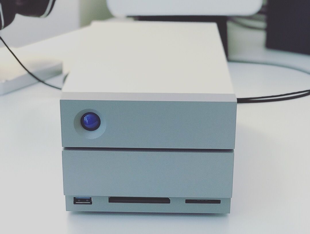 I use a LaCie 2big Dock Thunderbolt 3 drive. It is available in four storage configurations: 8TB, 16TB, 20TB, and 28TB and unlike previous 2big external drives where different configurations had different classes of hard drives, LaCie used the same enterprise-grade drives in each configuration which is nice. Each 2big Dock comes standard with two 7200-RPM Seagate IronWolf Pro enterprise-class hard drives (Seagate owns LaCie by the way) which boast 440MB/s read/write speeds.