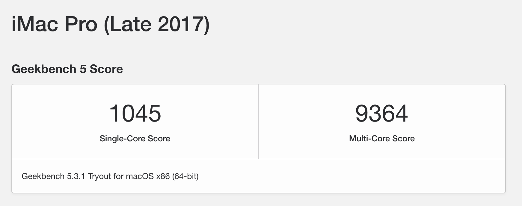 Just to keep things in perspective I'm also including my iMac Pro's GeekBench results here. As you'll see, the M1 scored higher in these benchmarks for single core performance but still significantly lower on the multi-core score. This is to be expected.