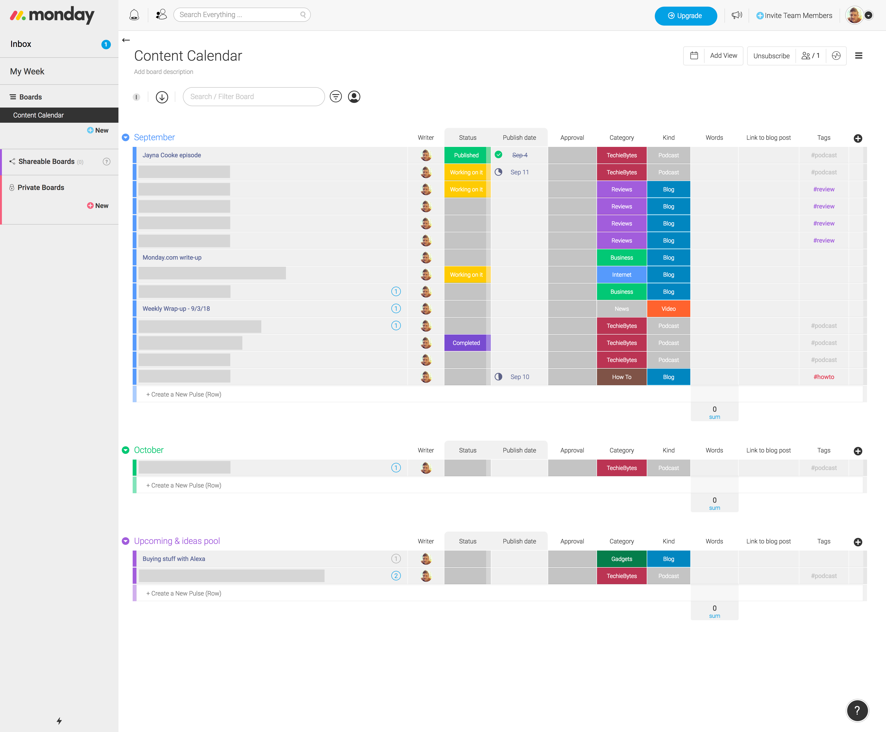 Each new row in a Monday.com board is called a Pulse–and each pulse can have additional data in it such as notes, files, and updates. As you can see from my content calendar board, you can create groups within the board for pulses to live in, as I did with August (currently archived), September, October, and the Upcoming & ideas pool. This helps me keep organized and makes planning content much easier.