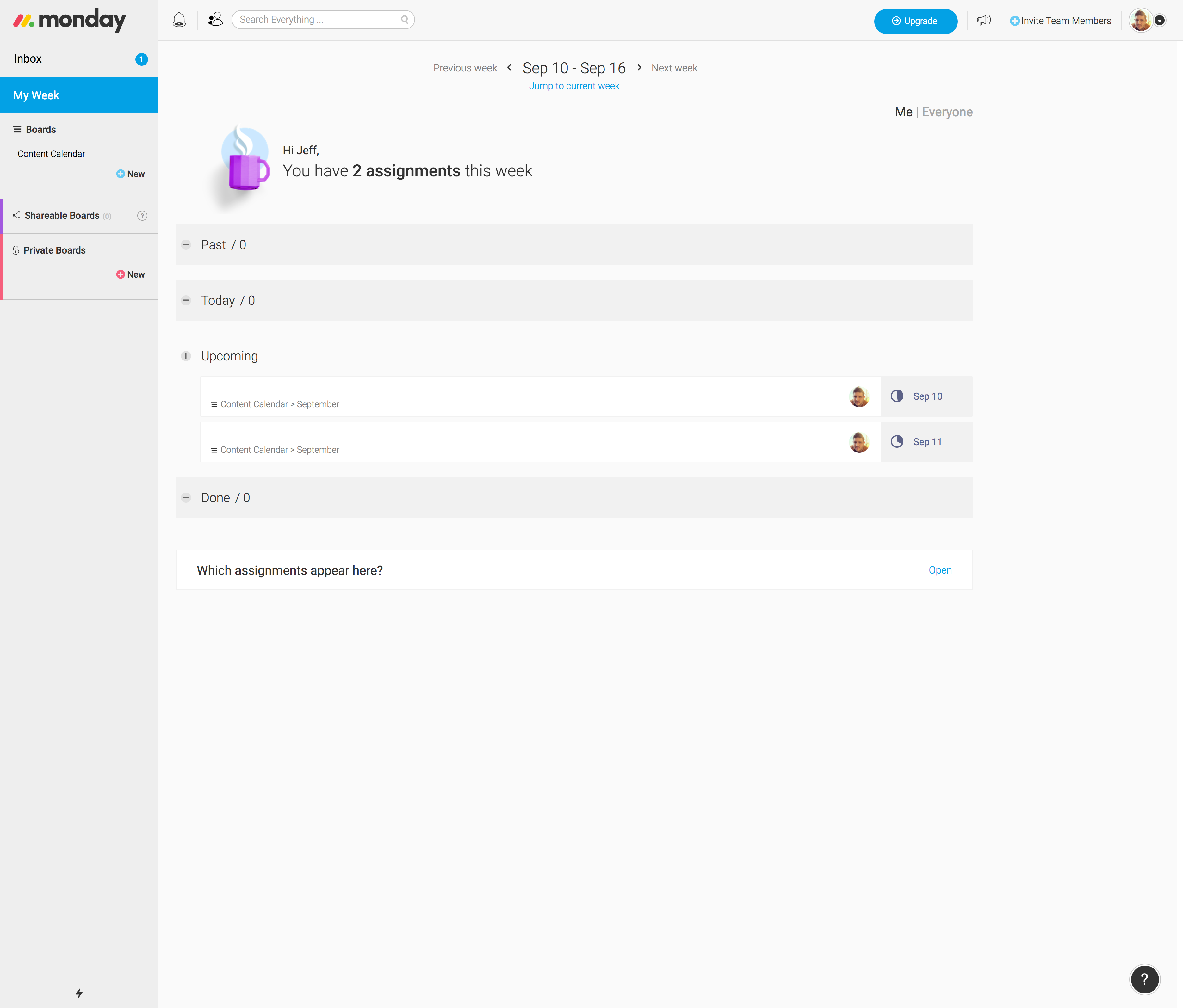 I really liked the Inbox and My Week feature in the product, it essentially acts as a todo list for you that is automatically populated based on the pulses you create and the dates associated with each pulse. Using this feature in addition to the content calendar board has essentially allowed me to reduce the number of apps I need to use to keep track of everything — and simplicity is always nice.