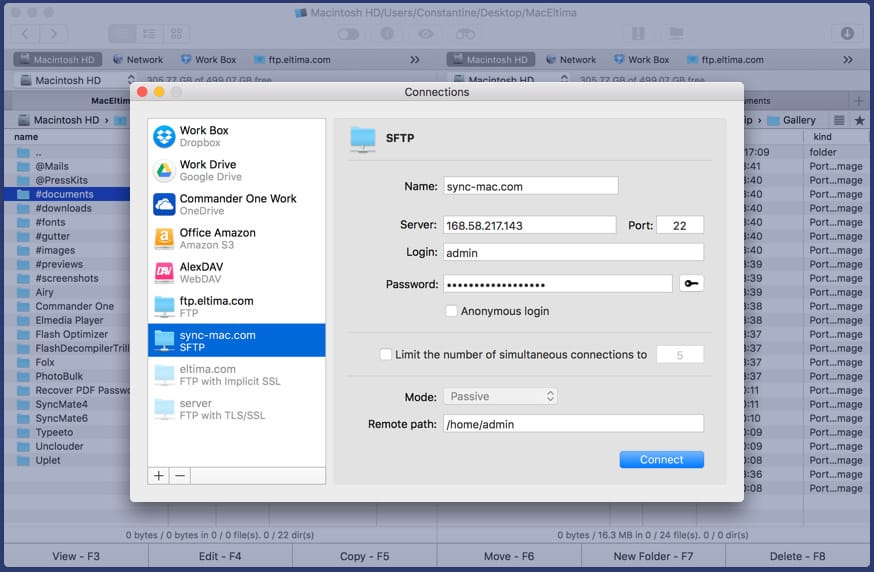So much of our data lives in places other than on our hard drive. Commander One takes this into account, providing a way for users to add their cloud accounts (such as Google Drive, Dropbox, and OneDrive) to quickly access and manage files on those services. And if you’re a developer, you’ll find the support for FTP accounts in Commander One especially useful when uploading files to remote servers.