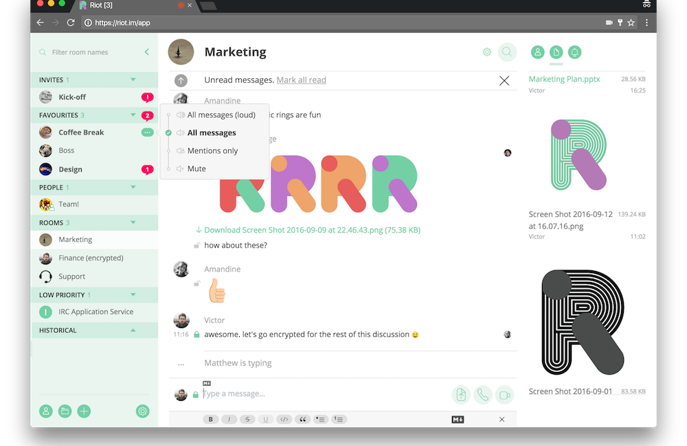 Meet Riot, an app that aims to provide a more secure online messaging experience that gives teams a workspace to communicate effectively. With Riot users can interact in real time and in one place with chat enhancing features like large group chat rooms, voice/video calling, simple file transfers and bots that help bring conversations to life.