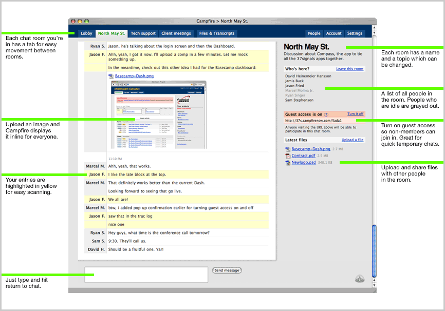 Campfire is a good quality messaging service. It offers better security than generic chat applications, so you can collaborate with colleagues without fear of confidential data getting into the wrong hands. Campfire is a web-based chat application. Users access password protected chat rooms via any browser. Campfire offers video conferencing, image uploads, and a host of extra features. It works on all devices, including smartphones.