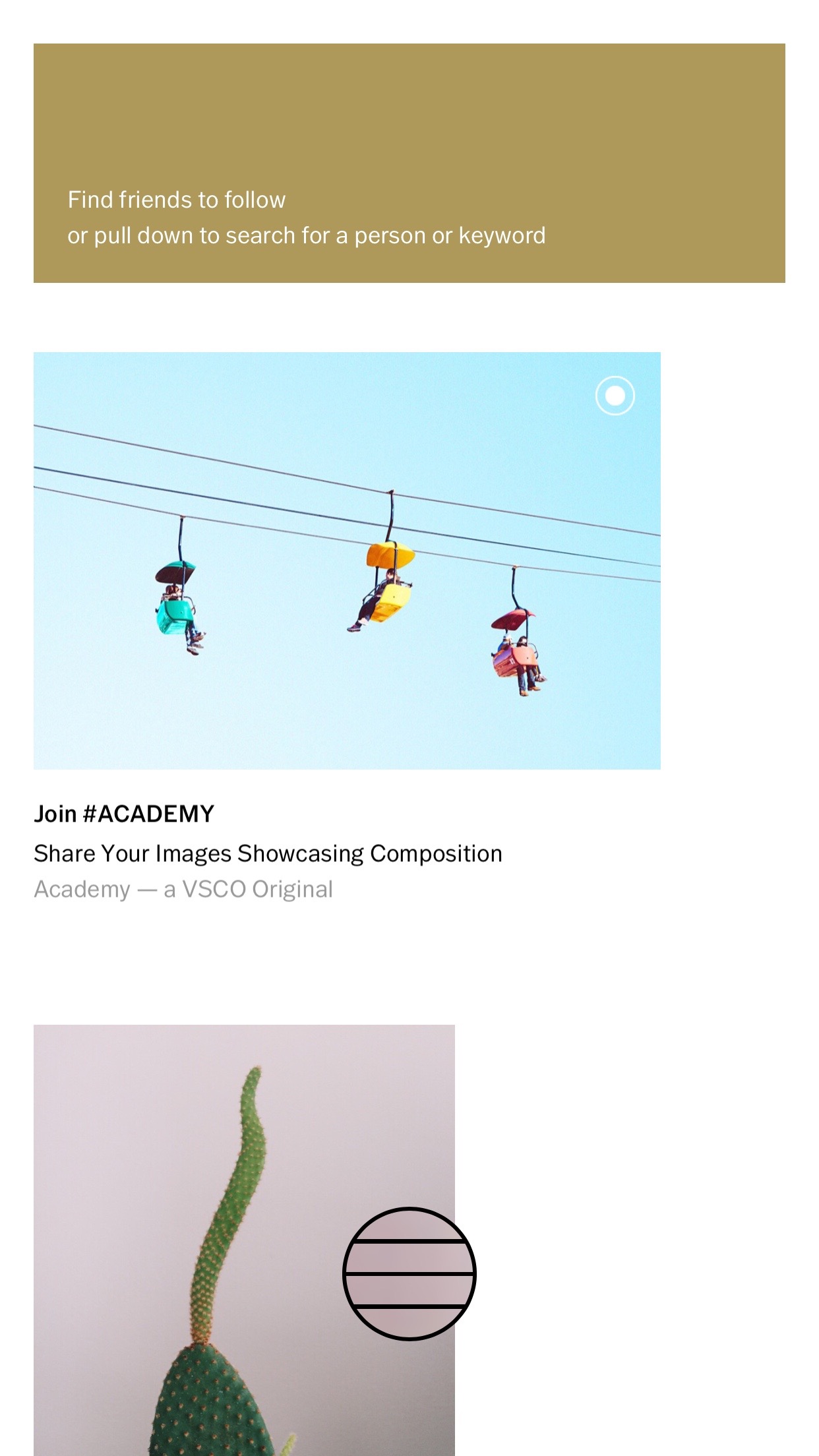 Here, take a look at the new home screen of VSCO. Can you immediately tell me what to do to open the camera? Do I tap on this weird looking lined circle/button thing? Do I swipe right? How about left? Or up? Find the answer below the screenshot.
