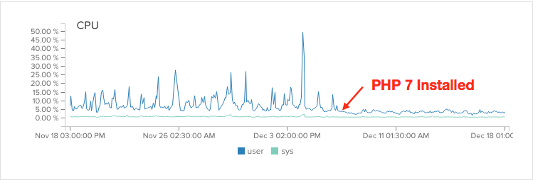 When I upgraded my server to PHP 7 I was immediately impressed with the speed increase, my WordPress-based site loaded so much faster and everything was much more responsive. But today, when I went to take a look at my servers CPU usage chart, I was in shock. I upgraded to PHP 7 on December 7 — a few days after the initial release and since then… well, have a look.