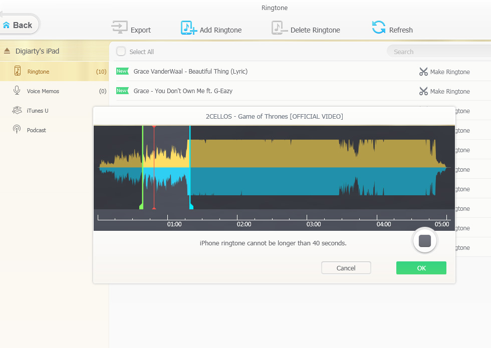 The ringtone creation tool is simple to use and effective. Simply add the song you want to create a ringtone with and selection the portion of the song you wish to use as the ringtone. It’s important to note that ringtones cannot be longer than 40 seconds and the app does a good job at ensuring you don’t exceed the limit.